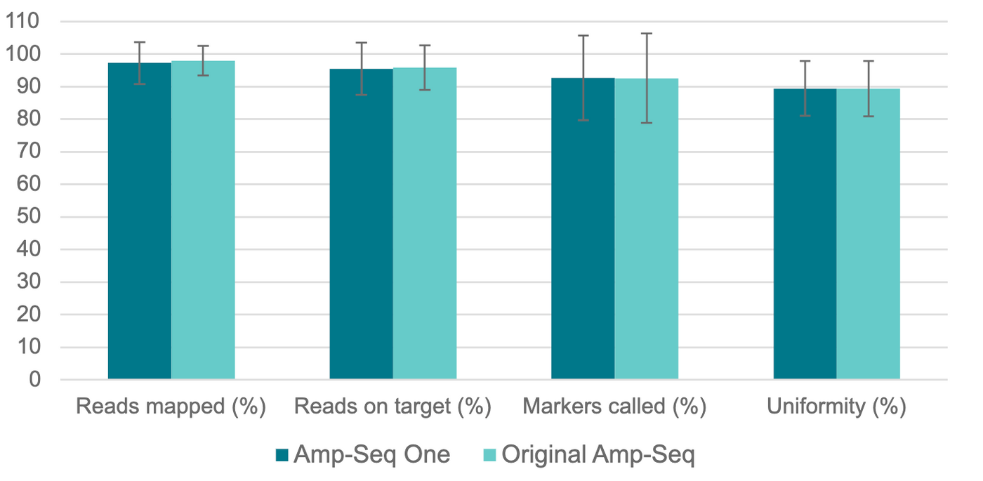 Figure 2. Dataset for 1,100 marker panel for soy, illustrating almost identical performance between Amp-Seq One and original Amp-Seq. DNA was purified using the sbeadex Plant kit (n=384). Sequencing depth 200X.