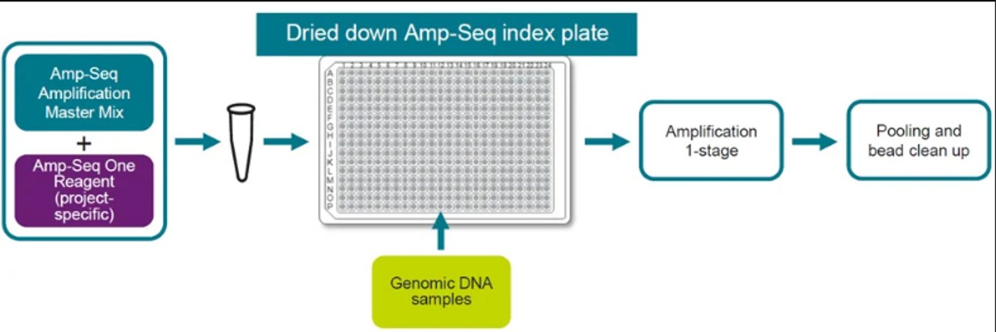 Amp-Seq is a midplex targeted GBS approach (up to 5,000 targets) that comprises high quality panel designs, simplistic workflows with maximum data generation (including minor allele frequency information), reduction of sequencing costs of up to 50% and considerations to environmental impacts (ambient temperature stable components and minimal dry ice shipping).